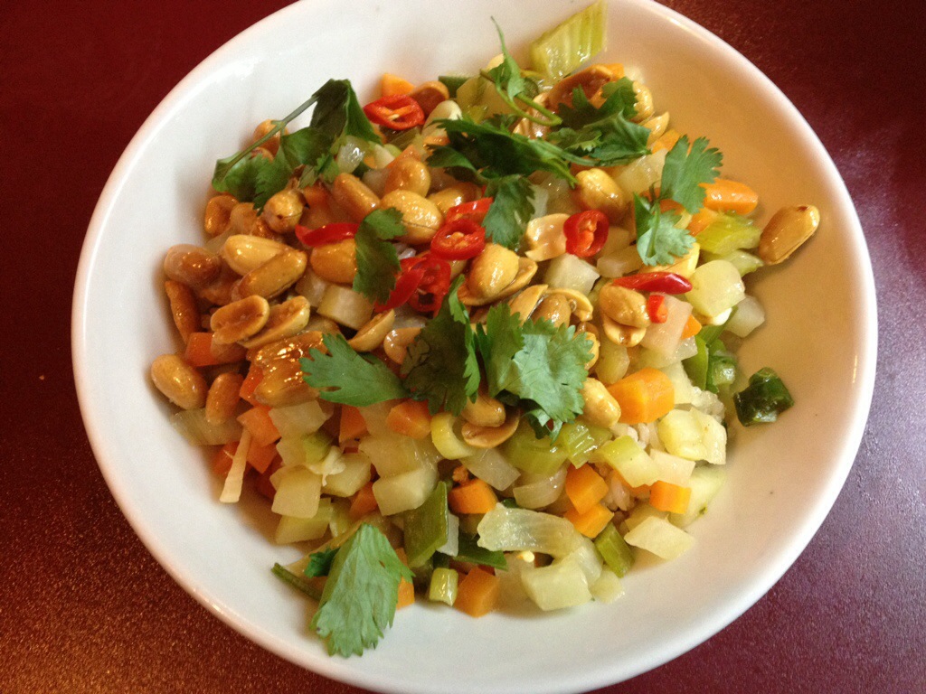 Den (gekochten und erkalteten) Reis hat sie nur mit etwas Öl, Zwiebeln und Knoblauch kross gebraten, das Gemüse hat sie separat zubereitet und danach untergemischt. So wird der Reis schön knusprig, sagte sie. Als Gemüse gab es kleine Würfel von Frühlingszwiebeln, Sellerie, Karotten und Kohlrabi, alles kurz gebraten und mit Sojasoße abgeschmeckt. Dazu röstete sie noch ein paar Erdnüsse und mischte zum Essen den Reis, das Gemüse und die Erdnüsse zusammen. Am Ende kam eine Handvoll gehackter frischer Koriander darauf.