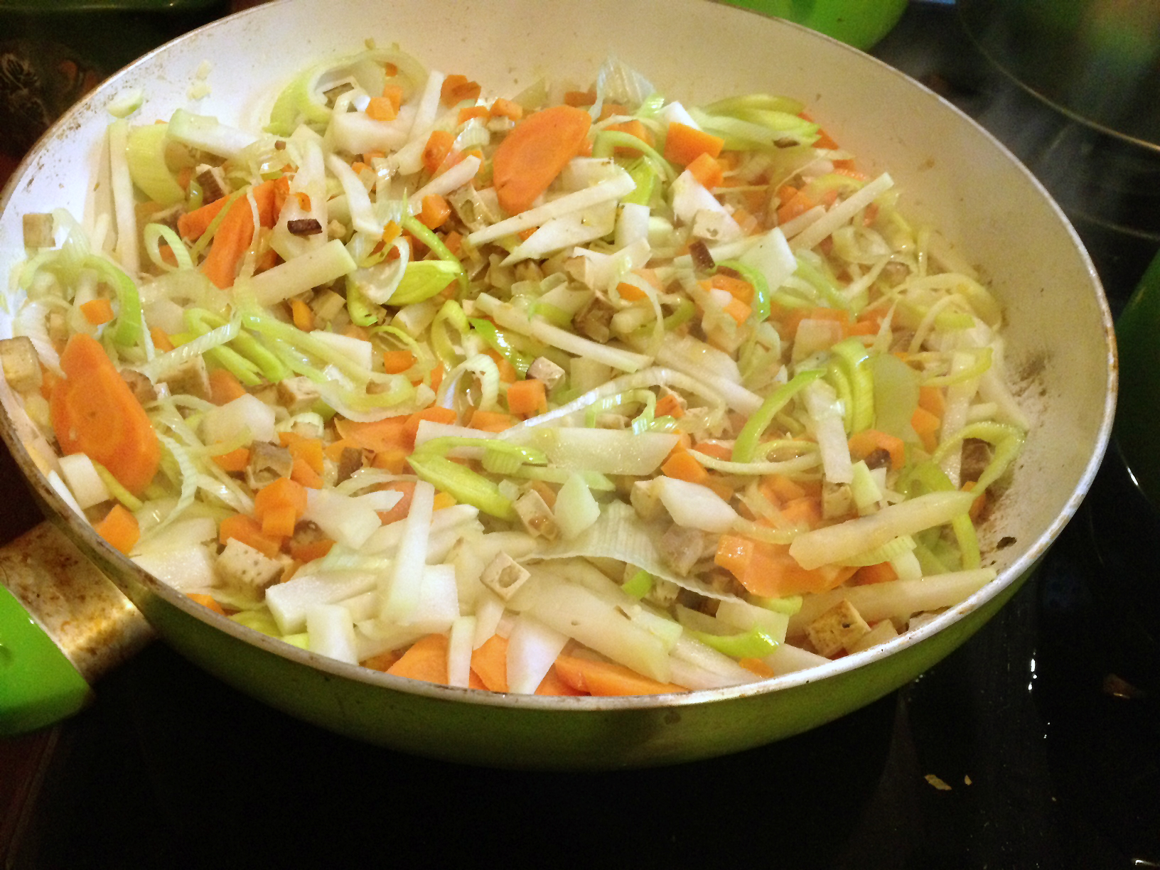 In meinem Fall habe ich Zwiebeln, Lauch, Karotten, Kohlrabi, Paprika und den Mandel-Nuss-Tofu von Alnatura zusammengeworfen und gut durchgebrutzelt. Die Paprika waren für einen Salat für meinen Geschmack schon ein bisschen zu runzelig, für eine Gemüsepfanne aber immer noch brauchbar.