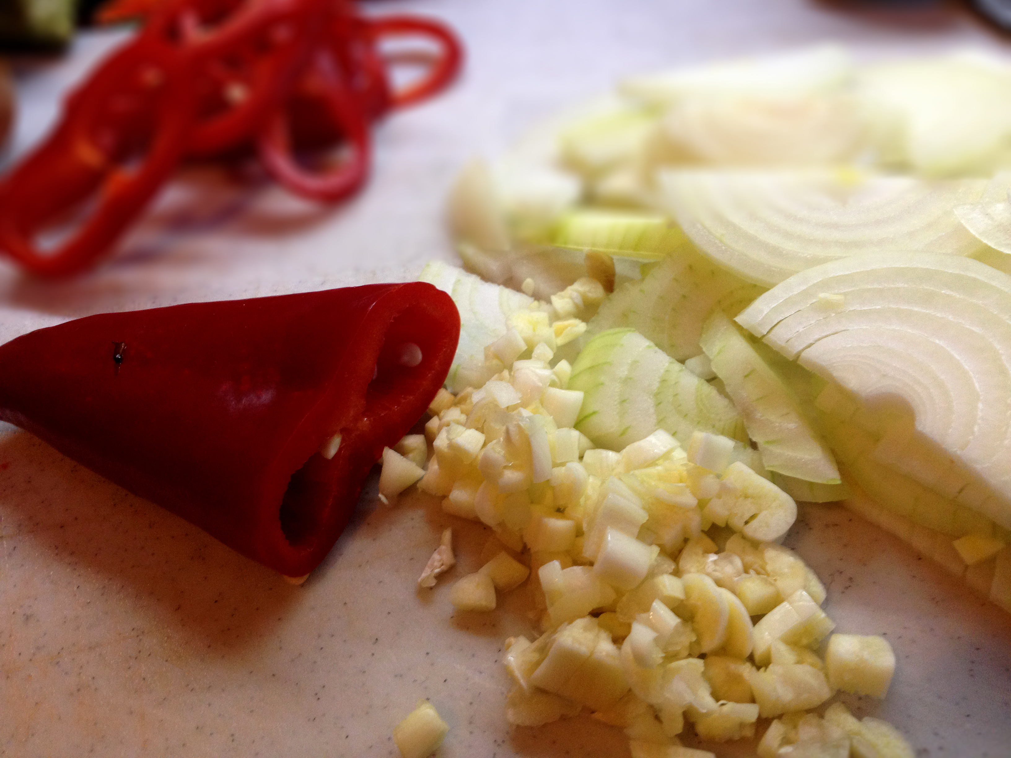 • Zwiebeln und Knoblauch  klein schneiden und in Sesamöl andünsten