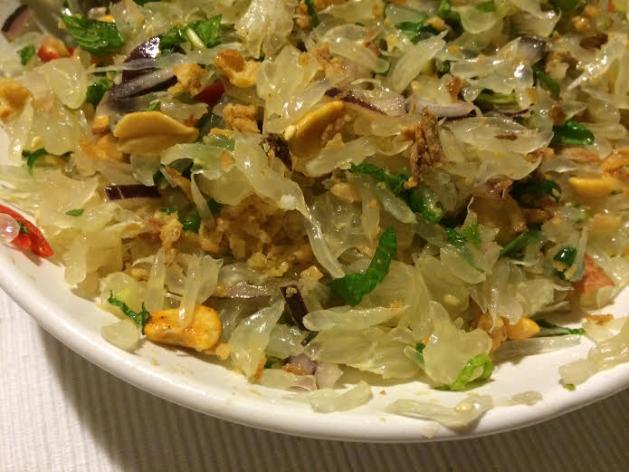 Diesmal war es ein Pomelo-Salat mit roten Zwiebeln, Minze, Röstzwiebeln, Erdnüssen und frischer Chili. Abgeschmeckt mit Salz, Pfeffer, frischem Limettensaft und nach Geschmack etwas Zucker. Wer mag, kann noch ein bisschen helle Sojasoße hinzugeben, das macht den Salat aber ein wenig dunkler.