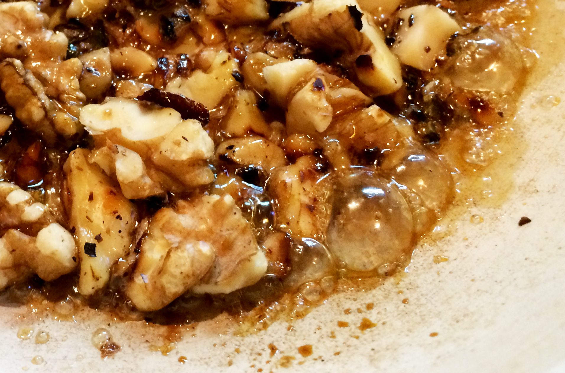 Eine schöne Abwechslung zu Sonnenblumenkernen oder gehackten Nüssen im Salat: Karamellisierte Nüsse. Probiert es doch mal mit gehackten Walnüssen und Paranüssen, die in Ahornsirup karamellisiert werden – so wird auch ein simpler Kopfsalat mit Karottenbändern zu etwas Besonderem. Darüber habe ich ein wenig Blütensalz, Pfeffer, Traubenkernöl und weißen Balsamico gegeben. Voilá, und schon steht ein Fünf-Minuten-Essen auf dem Tisch!
