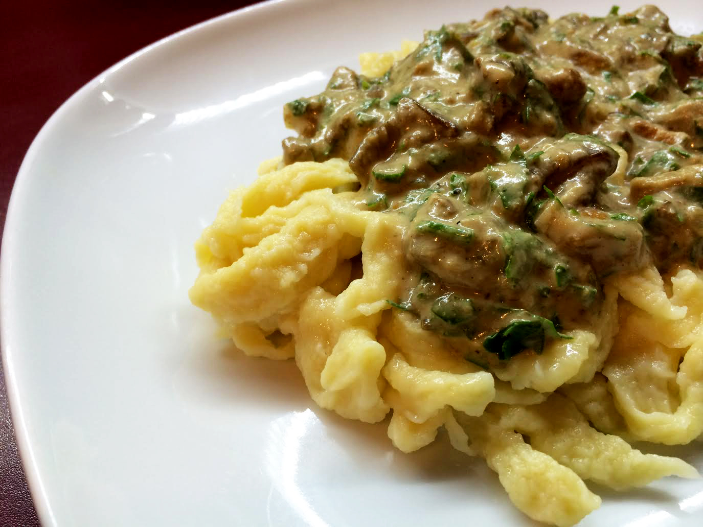 Abends dann selbst gemachte vegane Spätzle (Rezept hier) mit Pilzen in Hafersahnesoße und Petersilie.