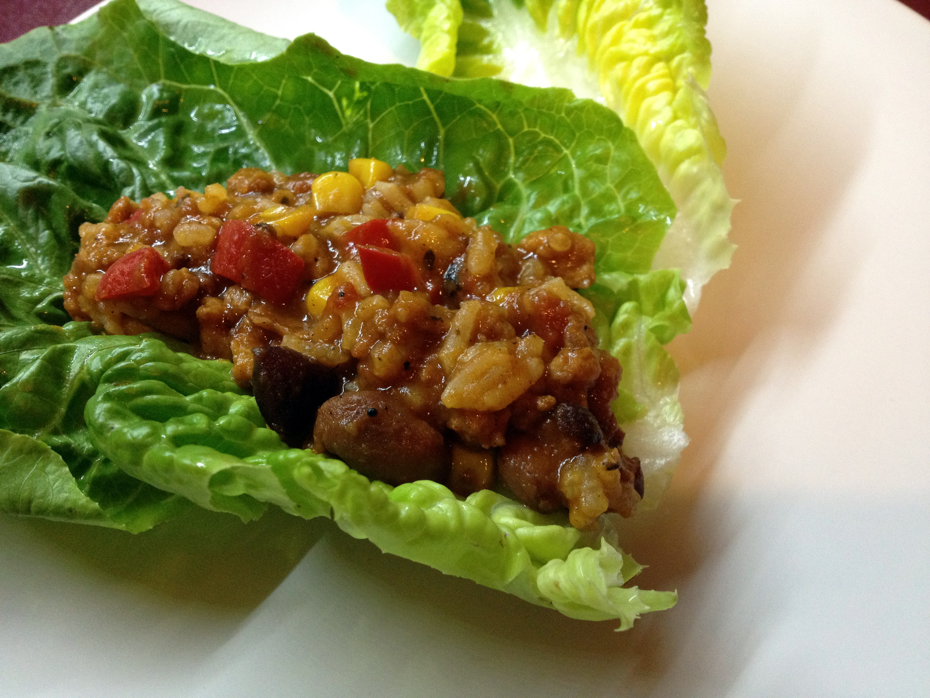 Ich habe ein Faible für alles, das man mit den Fingern isst und das in irgendetwas eingewickelt wird. Seien es vietnamesische Sommerrollen, Fajitas, afrikanisches Essen mit diesen löchrigen säuerlichen Fladendingern oder Salatwraps. Und wer sagt denn, dass man immer nur Rohkost in Salat einwickeln muss? Warum nicht einfach mal was Warmes? Sozusagen das, was man in einem Burrito tun würde, in Salat einwickeln? Und da wir zufällig noch Chili vom Vortag übrig hatten, aber nicht schon wieder Dasselbe essen wollten, haben wir noch ein bisschen Reis abgekocht, untergemischt und das Ganze dann auf Romanasalatblättern (wow, ganz schön viel „a“ hintereinander in diesem Wort) gegessen. Manche Blätter lassen sich einrollen, manche sind dafür zu klein. Macht nichts, wird dann einfach als Schiffchen verputzt – sieht auch irgendwie echt hübsch aus. Ein weiterer Vorteil: Man spart sich jede Menge leere Kohlenhydrate im Vergleich zu Chili mit Brot oder – noch schlimmer – Ciabatta oder Baguette. Ist zwar auch lecker, aber die Salatschiffchenvariante ist wesentlich figurfreundlicher – und macht zudem auch noch mehr Spaß zu essen 🙂