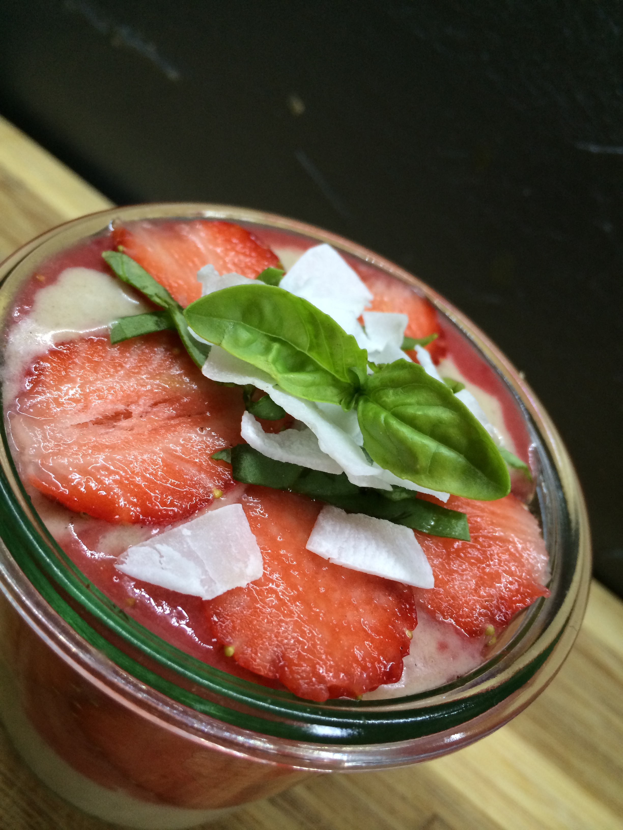 Da es gerade Erdbeeren gibt, habe ich es ganz minimalistisch gehalten: Bananen mit einem Schluck Mandelmilch und gemahlener Vanille im Mixer zu einer glatten Creme püriert, darauf dann pürierte Erdbeeren und mit Erdbeerscheiben, Kokoschips und Gojibeeren garniert. Den besonderen Kick geben ein paar Fitzel Basilikum: Ich lieeebe Basilikum mit Erdbeeren. Demnächst werde ich das mal ins Eis mischen. Ich habe das Ganze sofort gegessen – wer die Konsistenz etwas fester mag, kann es nochmal kurz in den Gefrierschrank geben. Aber Vorsicht: Wenn man es im Gefrierschrank vergisst und es kristallisiert, ist es nicht mehr cremig nach dem Auftauen!