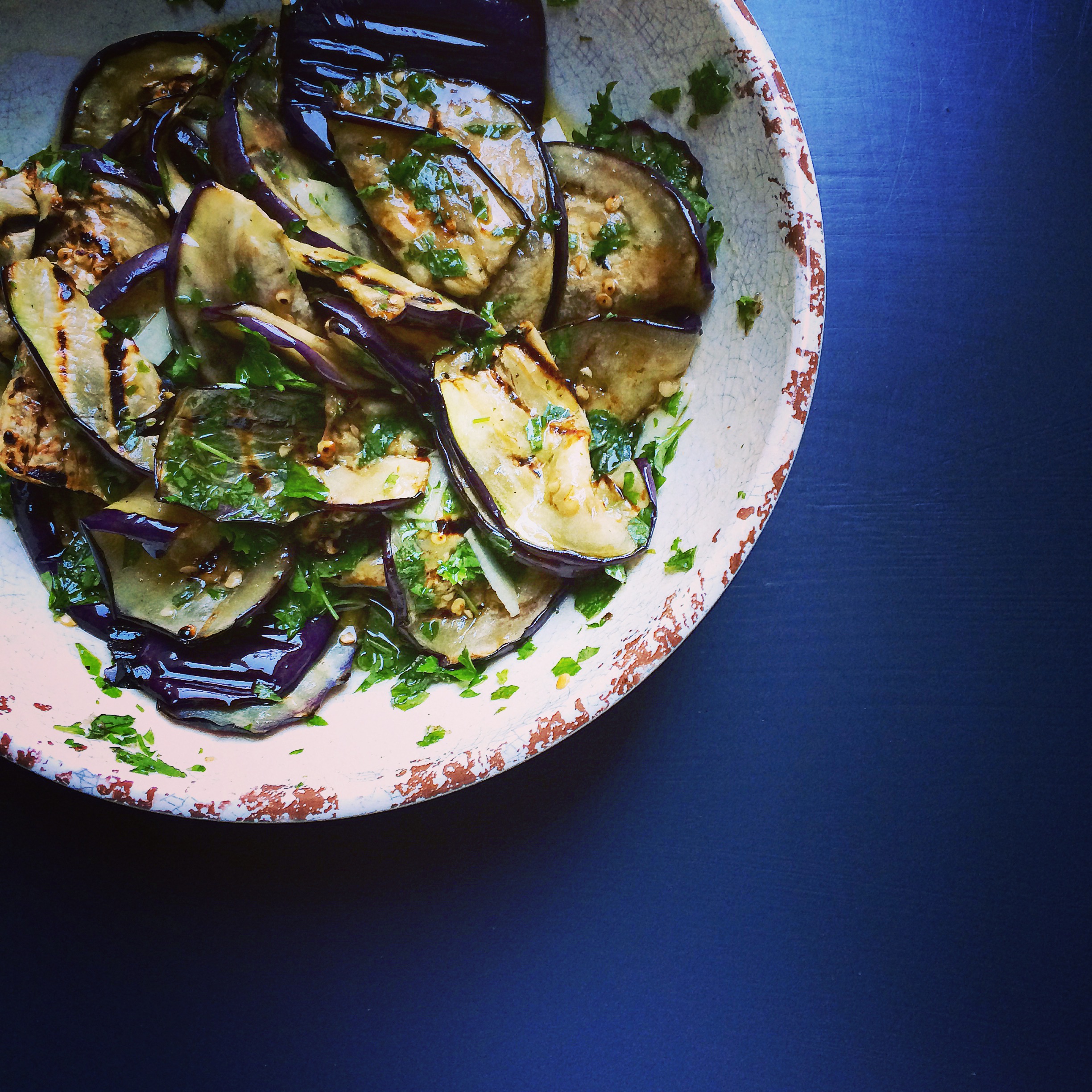 Gedacht, getan: Auberginen in Scheiben geschnitten, in Ermangelung eines Grills geschwind in einer Grillpfanne ohne Öl von beiden Seiten angebraten und mit Olivenöl, ein paar Spritzern Zitronensaft, Salz, Pfeffer, Knoblauch, Petersilie und Minze (hatte ich gerade beides auf dem Balkon) mariniert.