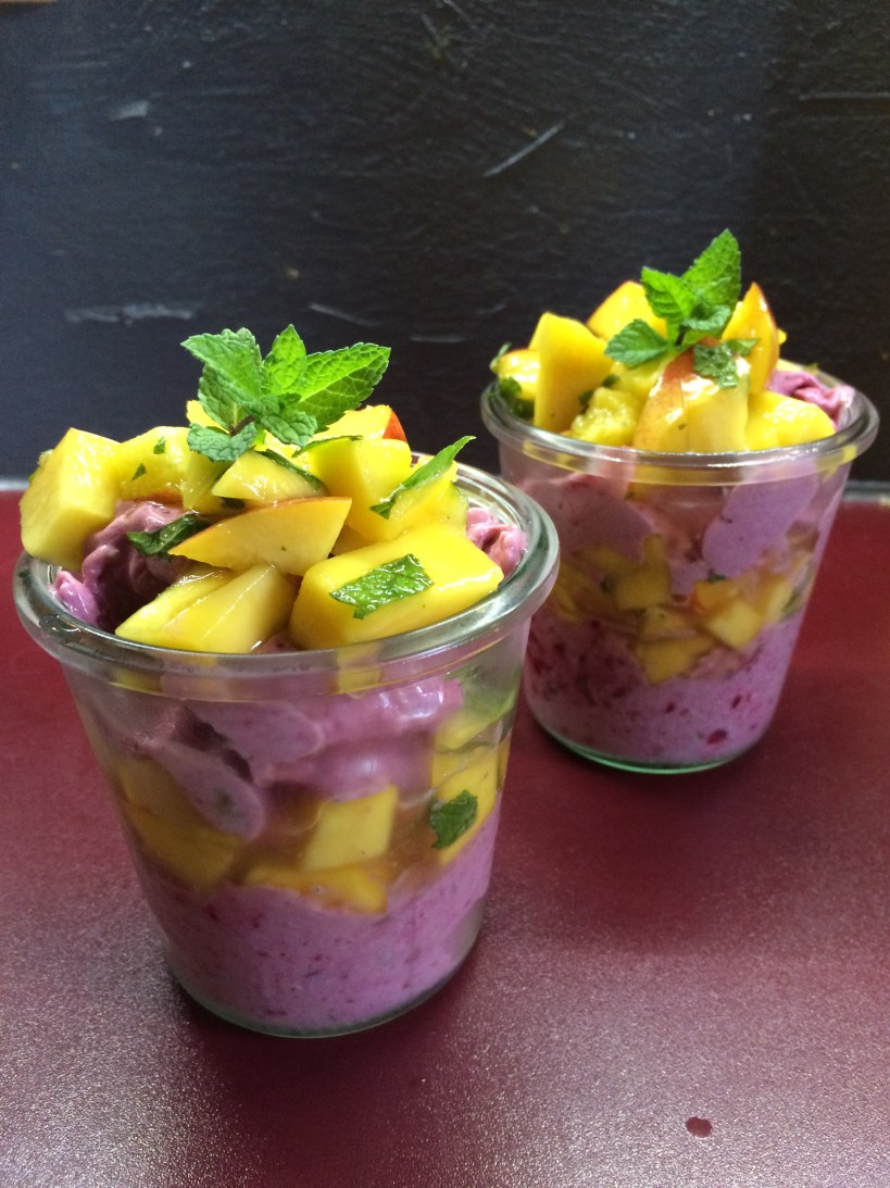 Veganes Himbeer-Basilikum-Chili-„Nicecream“ mit Holunder, Mango, Nektarinen und Minze