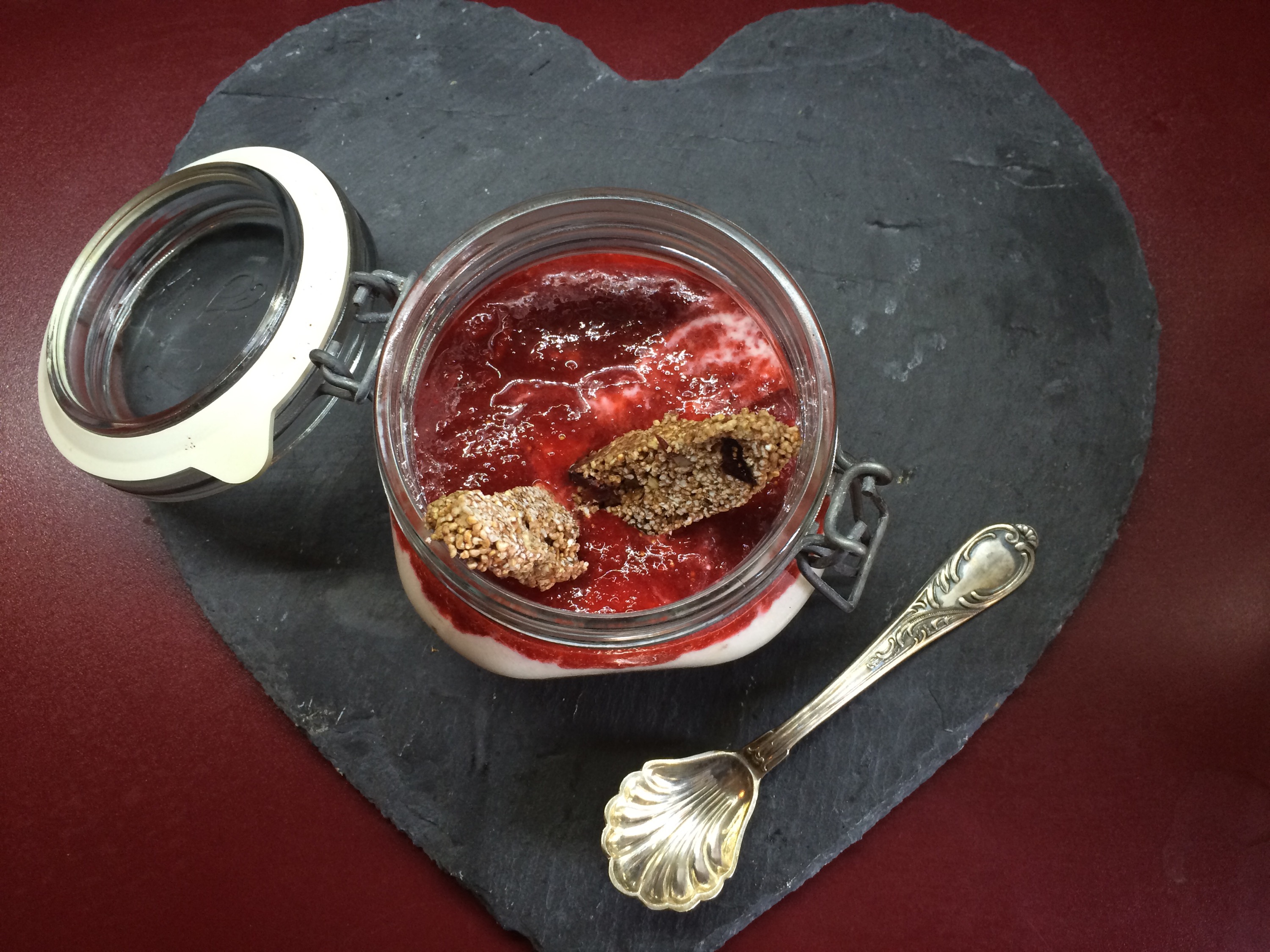 Auf 100 ml Hafermilch habe ich 4 EL Haferflocken, 1 EL Chiasamen, 2 EL gepopptes Amaranth und 2 EL Kakao gegeben. Wie immer über Nacht einweichen gelassen und am nächsten Morgen Sojajoghurt und frisches Erdbeerpüree darüber geschichtet. Für das gewisse Crunchy-Feeling noch einen Amaranth-Riegel obendrauf. Wenn das kein durch und durch gesundes Frühstück ist, weiß ich auch nicht. Und dazu noch so hübsch anzusehen! Erinnern fast ein bisschen an Schwarzwälder Kirschtorte *g*