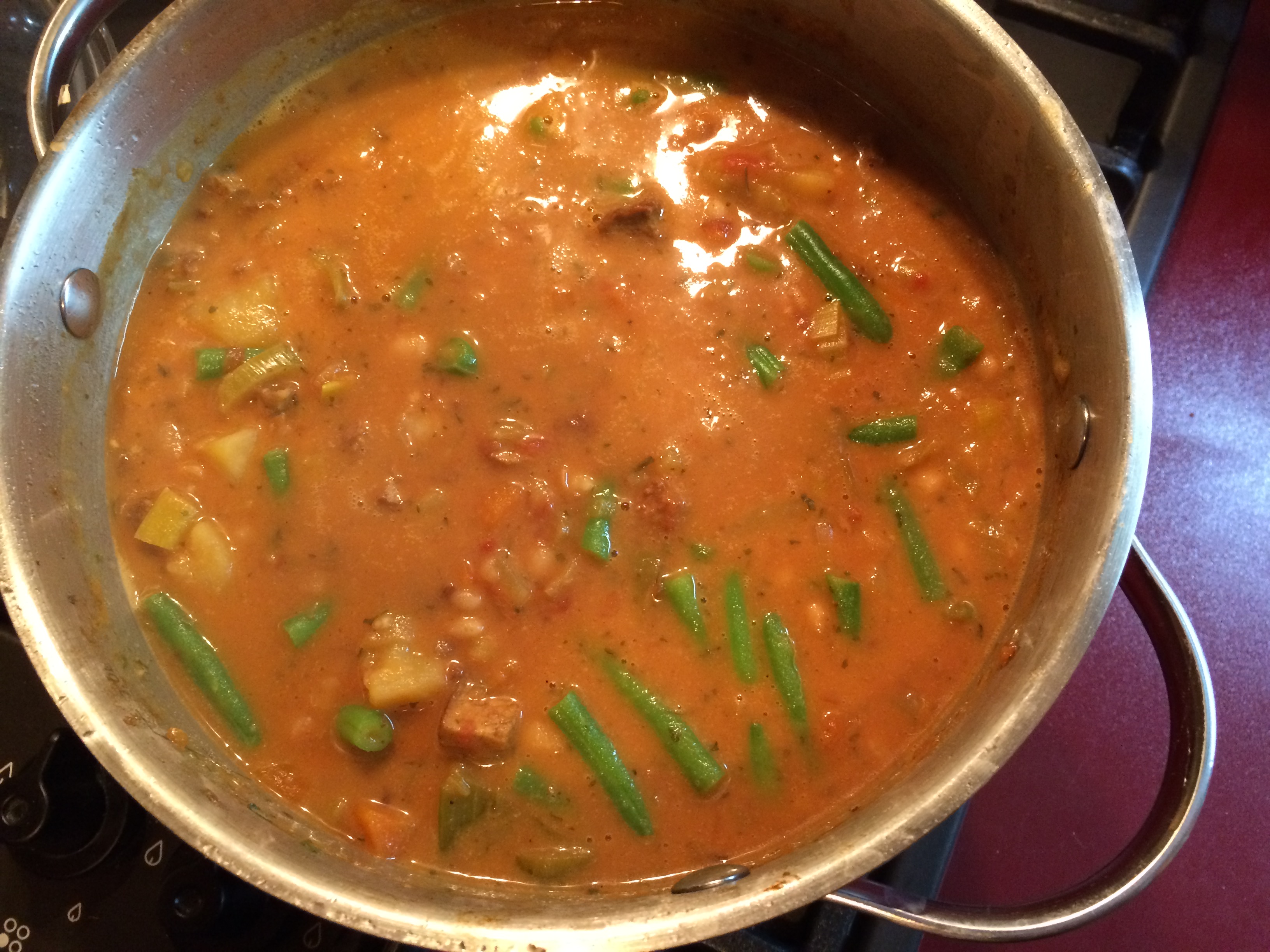 - Tomaten und Bohnen dazu geben, Knoblauch mit einer Presse zerdrücken und hinzu geben und weitere 20-30 Minuten köcheln (oder bis die Kartoffeln gar sind)