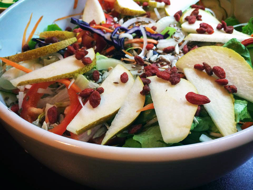 Heute habe ich mal wieder ein Salatrezept für Euch. Der Salat selbst besteht aus allem, was der Kühlschrank gerade her gab. Farblich ergaben vor allem Paprika-, Rotkohl- und Karottenstreifen einen tollen Kontrast. Geschmacklich habe ich das Ganze diesmal mit Sonnenblumenkernen, Birnen und Gojibeeren aufgepeppt. Die getrockneten Gojibeeren kauen sich ein bisschen wie kleine, harte, zähe Gummibärchen, was ich haptisch in Kombination mit den knackigen Gemüsejuliennes besonders lustig zum Essen fand.